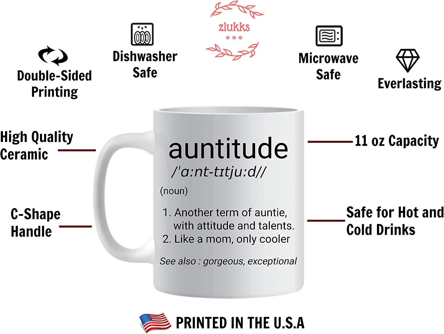 - PREMIUM QUALITY AND LOCALLY SUBLIMATED – Your mug for Aunt is professionally permanent sublimated with superior ceramic ink locally in the United States (U.S) on the highest quality, premium-grade strong, and durable lead-free, made from the best Ceramic. The mug is PRINTED ON BOTH SIDES and is 100% Dishwasher and Microwave Safe. This cup is made to last a lifetime and it will never fade or lose its glow no matter how many times you wash it. Therefore make a wonderful and long-lasting gift.