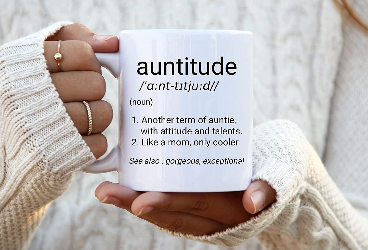 - TIMELESS DESIGN – This auntie mug makes a great novelty, affordable, inexpensive, funniest, creative, a unique gift within a budget of around 20 dollars. This two-tone ceramic coffee/tea mug is with an easy-grip/c-style grip handle, perfect and suitable for daily, everyday use at home, office, and restaurant. 11oz mug dimension – estimation of 3.12 in W x 3.75 in H.