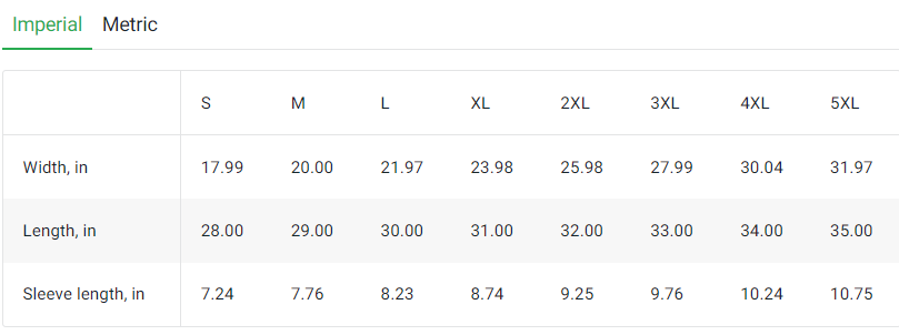 | Size | S, M, L, XL, 2XL, 3XL, 4XL |