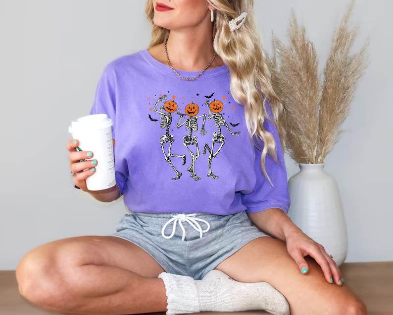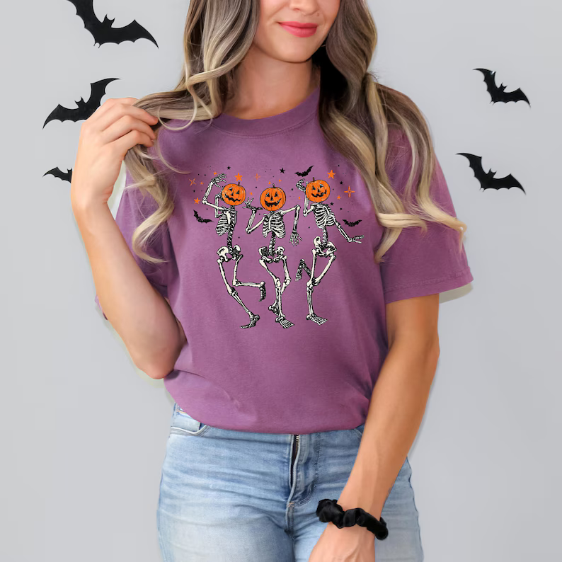 Comfort Colors Dancing Skeleton Pumpkin TShirt, Retro Halloween Women’s Shirt, Funny Fall Halloween Party Shirt, Spooky Season Skeleton Tee, For Men , For Women