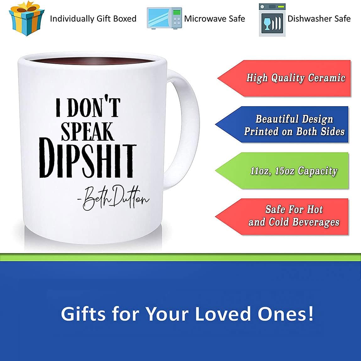 - Design and printed in USA: The Funny Yellowstone Quotes, Yellowstone Mug, I don’t speak dipshit Beth Dutton Mug, Funny Coffee Mug is printed in the USA. It’s made of high-quality ceramic and comes with stunning artwork that makes everyone happy to own it. There are cute and funny styles of artwork!
